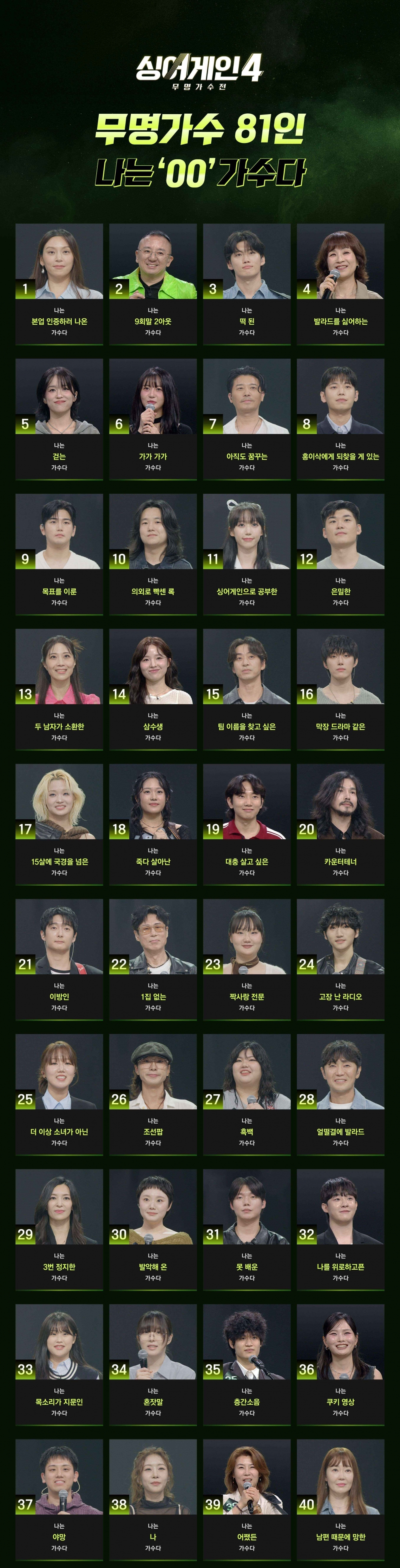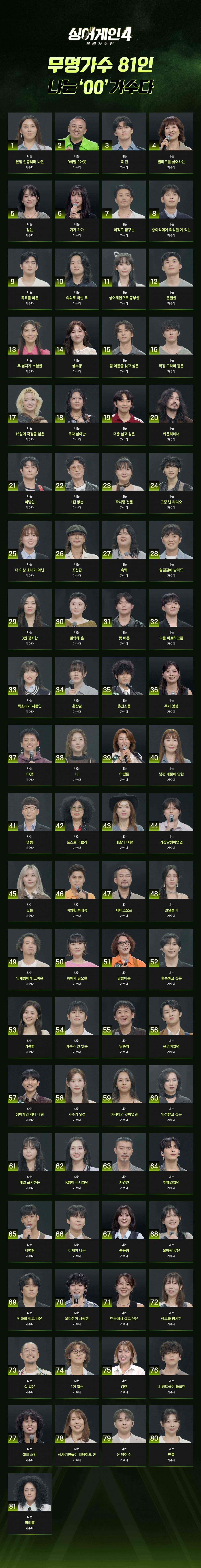 오는 10월 14일(화) 첫 방송되는 JTBC ‘싱어게인4-무명가수전’(기획 윤현준, 연출 위재혁/이하 ‘싱어게인4’) 측은 1일, 치열한 경쟁률을 뚫고 본선에 진출한 81인을 공개했다.