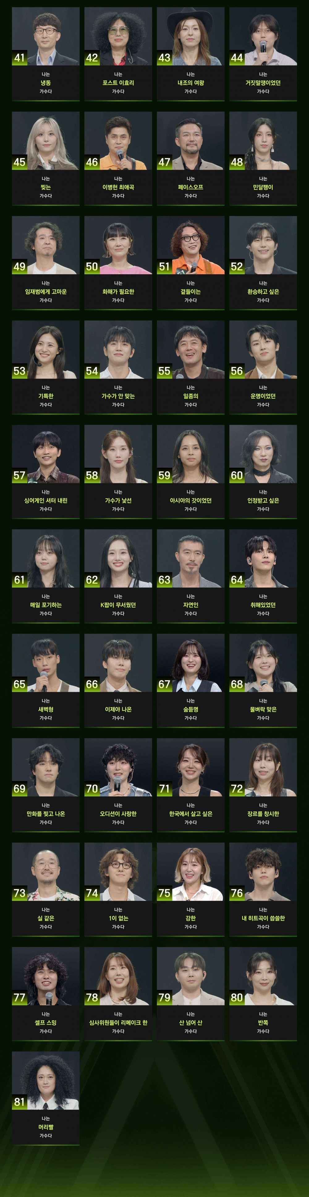 무엇보다 ‘싱어게인’만의 시그니처 한 줄 소개 문구가 궁금증을 한층 증폭시킨다. ‘나는 싱어게인으로 공부한 가수다’ ‘나는 싱어게인 셔터 내린 가수다’ 라는 소개는 ‘싱어게인 키즈’들의 반란을 기대케 한다. 또 ‘나는 홍이삭에게 되찾을 게 있는 가수다’ ‘나는 포스트 이효리 가수다’ ‘나는 임재범에게 고마운 가수다’ ‘나는 이병헌 최애곡 가수다’ 등으로 자신을 소개한 문구는 이들이 들려줄 노래와 인연을 궁금케 한다. ‘나는 아직도 꿈꾸는 가수다’, ‘나는 이방인 가수다’, ‘나는 KPOP이 무서웠던 가수다’ ‘나는 환승하고 싶은 가수다’ ‘나는 산 넘어 산 가수다’ ‘나는 화해가 필요한 가수다’ 등의 사연도 범상치 않다. 음악에 대한 진심 하나로 도전에 나선 81인의 무명가수들이 또 어떤 무대로 시청자들의 가슴을 뜨겁게 할지 기대된다.