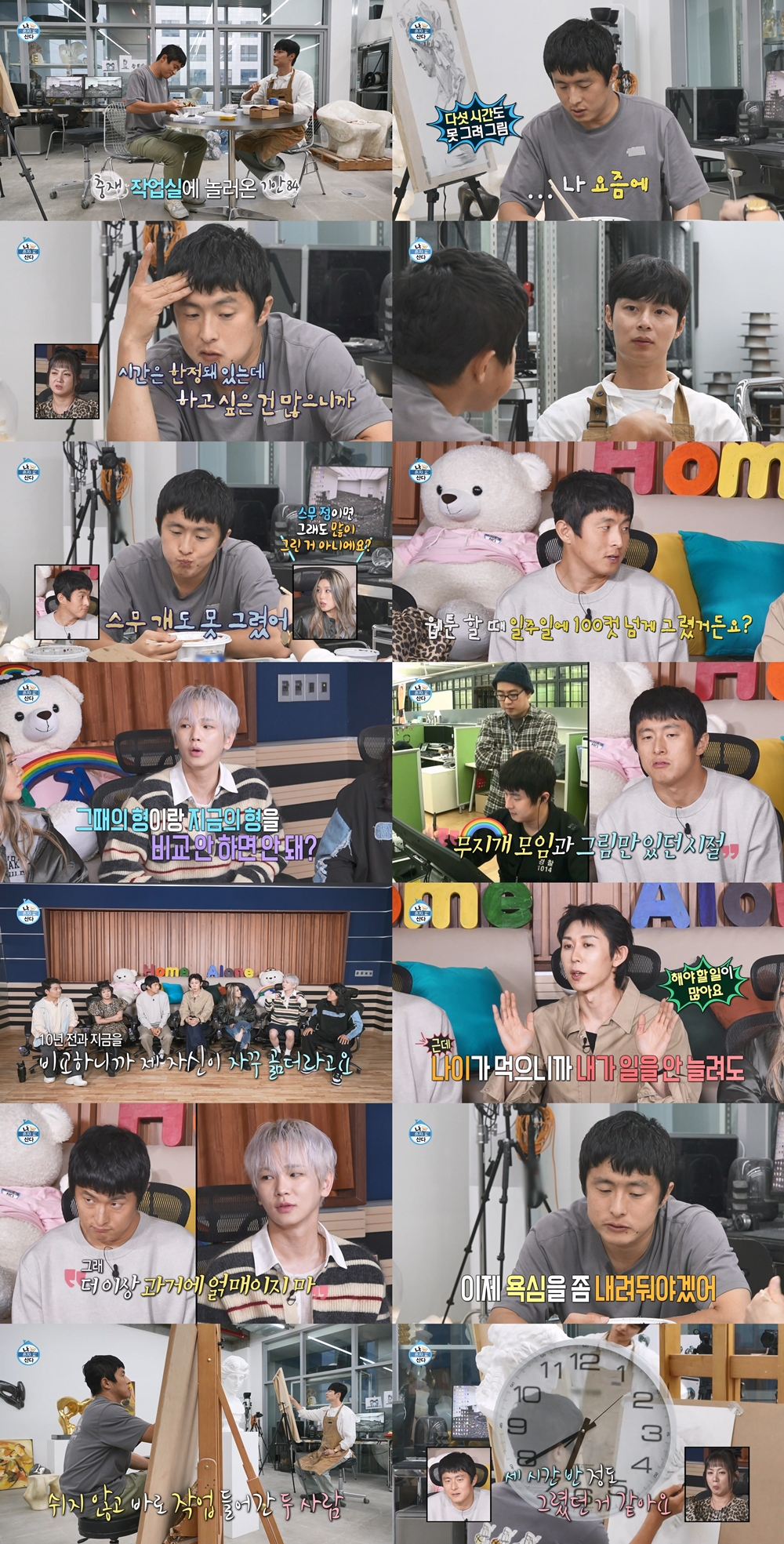 기안84는 “시간은 한정돼 있는데 하고 싶은 건 많으니까”라며 자신의 마음 상태를 밝힌다. 그는 “웹툰 그릴 때는 일주일에 100컷 넘게 그렸다. 미술 캔버스에 그리면 한 달에 4개의 완성작을 예상했다. 그때는 빨리빨리 했는데 갈수록 그림이 안 나온다”라며 무지개 회원들에게도 고민을 밝힌다.