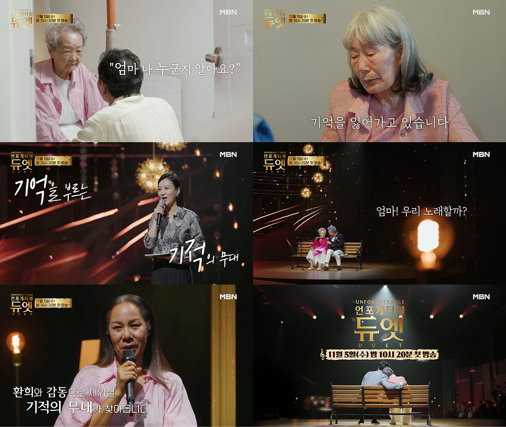 작년 추석, 한 회 방송만에 뜨거운 호평을 받으며 ‘콘텐츠 아시아 어워즈 2025’ 실버 프라이즈를 수상한 MBN 신규 리얼리티 뮤직쇼 ‘언포게터블 듀엣’은 치매로 기억을 잃어가는 출연자와 그를 기억하는 사람들의 감동적인 듀엣 무대가 그려지는 리얼리티 뮤직쇼. 출연자의 기억 속 노래를 찾아가는 여정과 가족이 함께 만드는 듀엣 무대, 그리고 그들 모두를 위로하는 ‘메모리 싱어’의 헌정 무대가 더해져 치매라는 병과 마주하고 있는 가족들에게 위로와 감동을 선사하며 잊지 못할 기억을 덧대어주는, 잔잔한 선물과도 같은 하루를 선사한다.