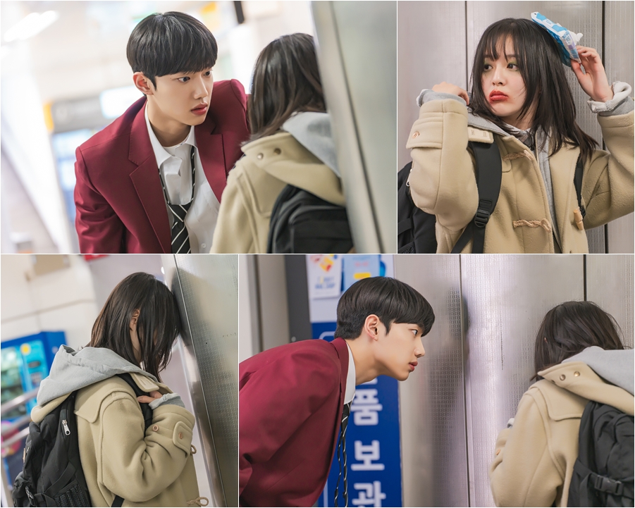 그런 우연 앞에 등장한 사람은 강렬한 와인색 교복 재킷을 걸친 기정. 그는 상황 파악도 없이 우연의 얼굴에 바짝 다가가 의심 가득한 눈빛으로 그녀를 바라보며, 마치 탐문 조사하듯 얼굴을 들이댄다. 기정의 대담한 태도와 뜻밖의 거리감 제로 접근은 우연을 더 혼란에 빠뜨리고, “미친 X인가?”라는 반응을 떠올리게 할 만큼 황당한 긴장감을 자아낸다.