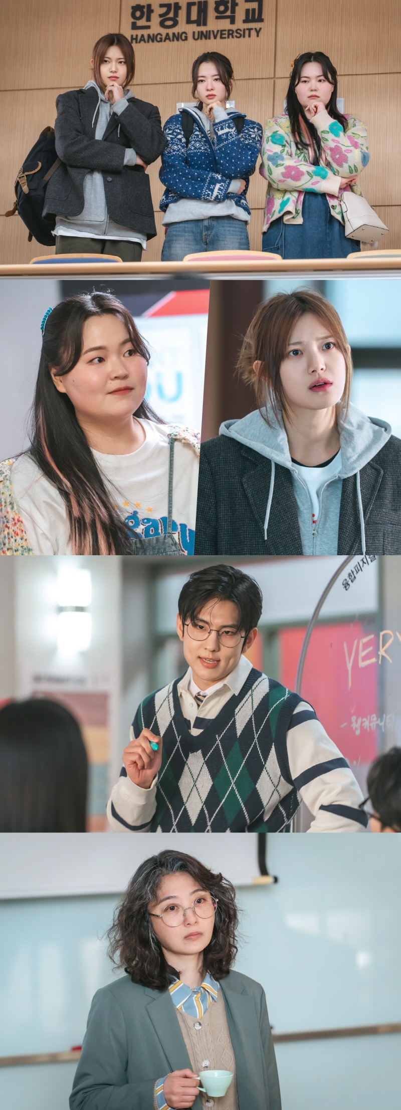 그런 가운데 공개된 사진 속 한강대학교 컴퓨터 공학과 삼인방의 모습이 시선을 사로잡는다. 나란히 서 있는 자태만으로 일심동체로 똘똘 뭉친 이들의 관계성을 엿볼 수 있다. 먼저 웹 소설 같은 사랑을 꿈꾸는 BL 마니아 ‘양나래’는 권영은이 연기한다. 제대로 된 연애를 해본 적 없는 그의 최대 관심사는 ‘연애’. 모델학과와의 통폐합을 반기며 호시절을 꿈꾸지만, 막상 실속은 없는 인물이다. 권영은은 능청스러운 친화력으로 강민학을 비롯한 모델학과 학생들과 특별한 인연을 쌓아 나가는 양나래를 맡아 재미를 더한다.