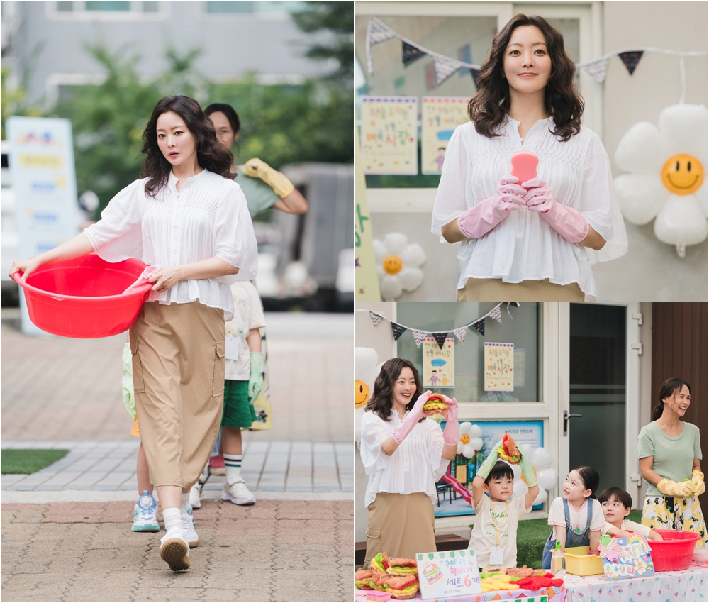 공개된 스틸 속 김희선은 빨간 대야를 옆구리에 끼고 위풍당당 어디론가 향하는가 하면, 분홍 고무장갑을 낀 채 수세미를 들고 환하게 미소 짓고 있어 관심을 모은다. 이는 나정이 같은 아파트 절친의 딸이 만든 수제 수세미 판매를 돕는 장면. 판매대 앞에 선 순간 김희선은 반짝이는 눈빛과 생생한 표정으로 돌변, 과거 ‘분당 4천 찍던 억대 연봉 쇼호스트 조나정’의 바이브가 소환돼 흥미를 끌어올린다.