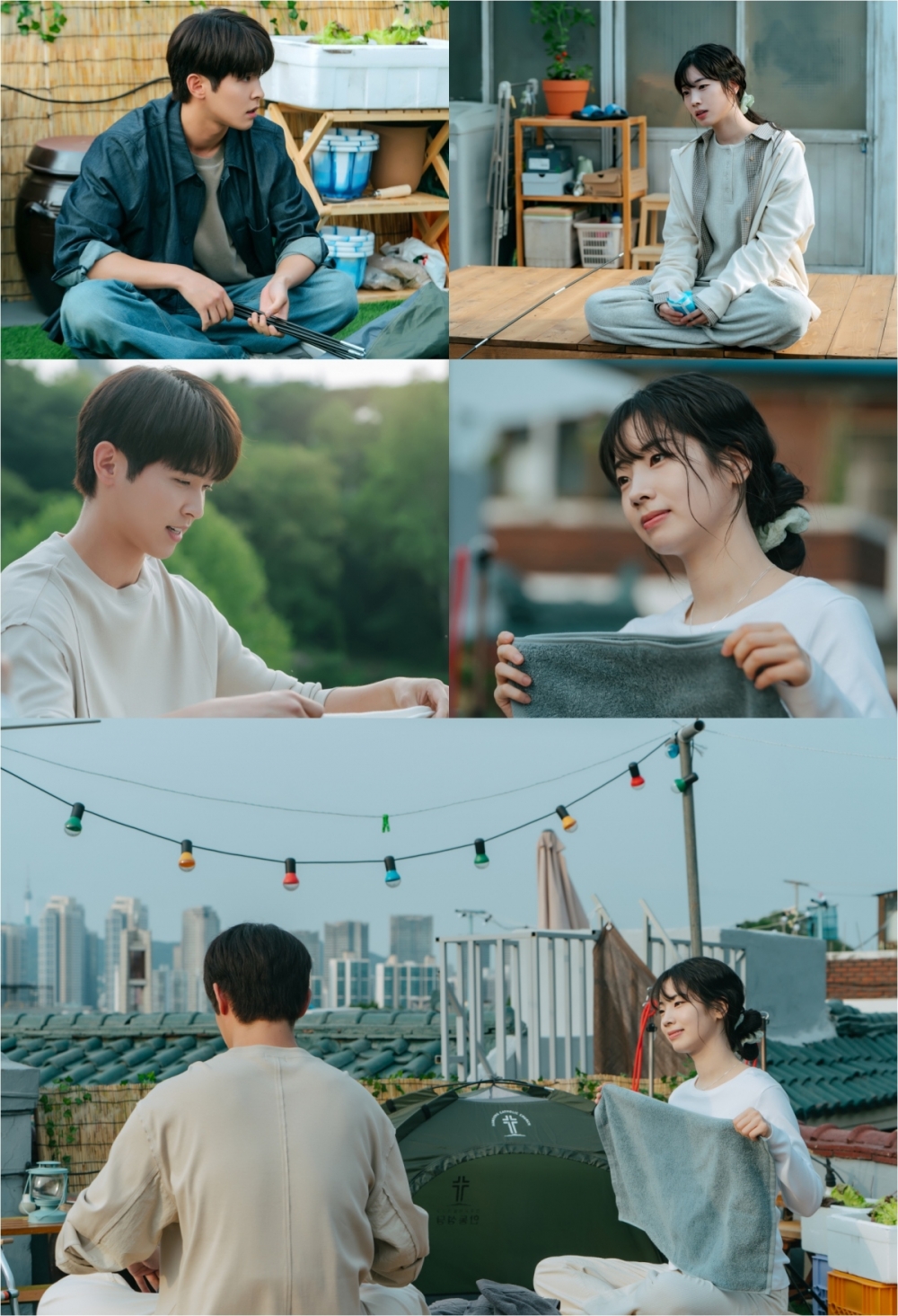 그렇게 쌓여온 준서의 불안은 진호가 집을 정리할 계획을 꺼내며 결국 터져버렸다. 태어날 때부터 살았던 자신의 공간마저 사라지는 듯한 느낌, 자신이 가족 안에서 마치 돌봐줘야 할 짐처럼 취급받고 있는 감정을 건드렸다. 결국 집을 나가겠다고 소리친 뒤 뛰쳐나온 준서. 오늘(15일) 공개된 스틸컷에서는 그가 혜온의 옥탑방으로 향한 정황이 포착됐다. 옥탑에 텐트를 치고 있는 준서와 그런 그를 ‘그럴 줄 알았다’는 듯 바라보는 혜온, 그리고 함께 빨래를 정리하는 모습까지 공개됐다. 마치 신혼부부가 된 것만 같은 바이브가 청춘 멜로의 설레는 한 페이지를 쓰고 있다.