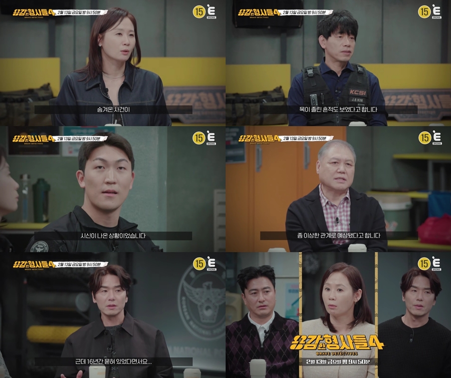 오는 13일 방송되는 티캐스트 E채널 ‘용감한 형사들4’(연출 이지선) 71회에는 김진우, 진성현 형사와 과학수사대(KCSI) 윤외출 전 경무관, 김진수 경감이 출연해 수사일지를 공개한다. 배우 김태훈이 게스트로 함께하며 활약을 예고했다.