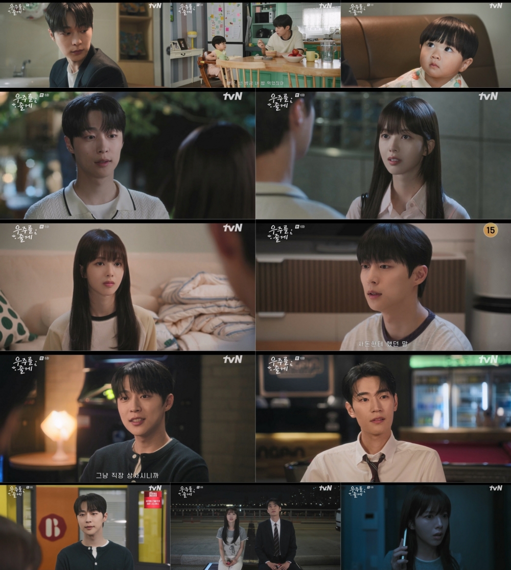 지난 19일 방송된 tvN 수목드라마 ‘우주를 줄게’(연출 이현석·정여진, 극본 수진·신이현, 기획 스튜디오드래곤, 제작 씬앤스튜디오 주식회사) 6회에서는 고백 이후 미묘한 거리감을 두는 선태형(배인혁 분)과 우현진(노정의 분)의 모습이 그려졌다. 여기에 우현진의 마음을 얻기 위해 본격적으로 움직이기 시작한 박윤성(박서함 분)의 직진은 세 사람의 로맨스 삼각관계 향방을 더욱 궁금하게 했다.