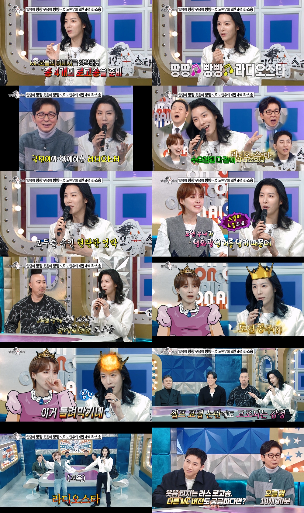 노민우가 12년 만에 ‘라디오스타’에 출연해 직접 만든 4MC 맞춤 로고송을 선물한다. 그는 4MC의 취향과 매력에 맞춰 다채로운 스타일의 로고송 무대를 선보이는데, ‘모태 프린스’ 노민우와 ‘도연 공주’ 장도연이 손을 맞잡은 클라이맥스 무대가 포착돼 시선을 사로잡는다.