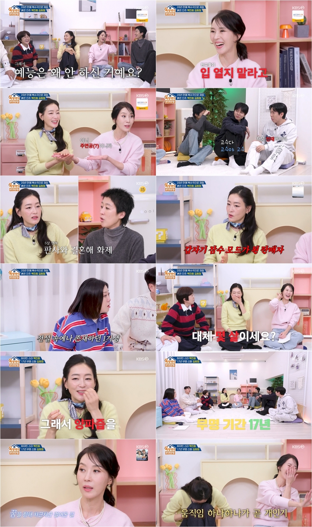 또한 김희정은 SBS 공채 배우 1기 출신임을 밝히며 "당시 회당 출연료가 만 원이었다. 그때는 휴대폰, 삐삐도 없던 시절이라 집 전화를 못 받으면 일을 놓칠 수도 있어 집 밖을 안 나갔다"라고 전했다. 이때 전설의 1기생을 처음 본 송은이와 김숙은 "저 언니 몇 살이야! 지박령 아냐?"라고 입을 떡 벌려 배꼽을 잡게 만들었다.